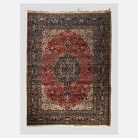 Mitte 20. Jh., feiner Seidenteppich in heller Tonigkeit, Mittelrosetten flankiert von floralem Rankwerk, mehrteilige umlaufende Bordüren, Fransenbesatz, leichte Altersspuren, Maße 159 x 105 cm.