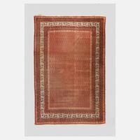 um 1930, reicher geometrischer Dekor, mehrstufige, umlaufende Bordüren, kleinere Randbeschädigungen, verzogen, reinig.bed., Maße 279 x 172 cm.