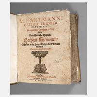M. Hartmanni Creidii, Fridberga-Wetteraui, evangelischen Predigers in Augspurg, Unterschiedliche christliche Hochzeit-Sermonen, gehalten in der Haupt-Kirchen bey St. Anna ..., in Verlegung Johann Beyers, getruckt bey Antoni Hummen, Frankfurt 1652, angebunden Die vier Hauptpuncten der christlicher seligmachenden Religion ... durch Conrad Burckhart/Diacon der Kirchen zu Zürich, bey Joh. Heinrich Hamberger, in Verlegung Michael Schaufelbergers, Zürich 1656, Format 8°, 4 Blätter, 426 S. und 8 Blätter, sowie 6 Blätter, 586 S. und 4 Blätter, Druckervignette, im Pergamenteinband der Zeit, gebräuntes, fleckiges Exemplar wenigen Anobienspuren, Pergament gelockert.