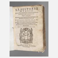 La Historia d'Italia di M. Francesco Guiccairdini Gentil 'huomo Fiorentiono, diuisa in venti libri ... per Tomaso Porcacchi ..., appresso Fabritio Zanetti, in Trevigi 1604, Format 8°, 22, 28, 489 und 112 Blätter (ital. Text), mit gestochener Druckermarke und wenigen Initialen, im Pergamenteinband der Zeit, partiell fleckiges Exemplar mit wenigen Randläsuren und Anobienspuren, vier Blätter mit Textverlust.