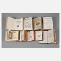 neun versch. Bände in lateinischer Sprache, darunter Horaz, Anacharsis, Drakenbrochs Titi Livii (Band 5), Schirachs Antiquitatum Romanarum etc., versch. Auflagen und Verlage, um 1750, untersch. gebunden und erhalten.