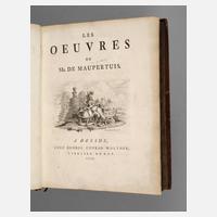 Les Oeuvres de Mr. de Maupertuis, chez George Conrad Walther, Dresde 1752, Format Gr. 8°, 14 Blätter und 404 S. (frz. Text), mit gestochener Titelvignette (Bernieroth fc. Lips. 1752) und einigen figurale Vignetten, Lesebändchen, marmorierter Schnitt und Marmorpapier-Vorsatz, in Ledereinband jüngerer Zeit mit dekorativer Goldprägung, stockfleckiges Exemplar der Erstauflage mit partiellen Anstreichungen und handschriftl. Annotationen, Einband etwas berieben.