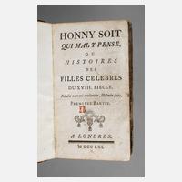 Honny soit qui mal y pense, ou histoires des filles celebres du XVIII. siecle, fabulae narrari creduntur, historiae sunt, premiere et seconde partie, (par Jean-Auguste Jullien), a Londres 1761, Format 12°, 170 S. (frz. Text), mit wenigen Vignetten, Rotschnitt, im Pappeinband der Zeit, Exemplar der Erstauflage mit Alters- und Gebrauchsspuren, Vorsatz mit handschriftl. Annotationen.