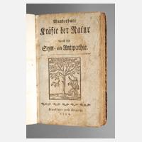 Wunderbare Kräfte der Natur durch die Sym- und Antipathie, beinhaltet: D. Barth. Carrichters gründliche Heilung der Zauberei … neue und verbesserte Auflage, Frankfurt/Leipzig 1772, Abhandlung von der natürlichen Magie, 1771, Kurze Betrachtung der Alraunwurzel des Fahrnkrauts und seines Samen, Prag 1702, sowie Sym- und antipathetische Verborgenheiten der Natur zum Nutzen der Menschen und des Viehes, Prag 1772, Format Kl. 8°, insges. 124 S., mit einigen Vignetten, im Halbleineneinband jüngerer Zeit, alt restauriertes, stockfleckiges Exemplar, letzte Teil der alchimistisch-okkulten Jahrmarktschrift mit drei fehlenden Blättern.