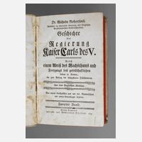 Geschichte der Regierung Kaiser Carls des V., nebst einem Abriß des Wachsthums und Fortgangs des gesellschaftlichen Lebens in Europa, bis zum Anfang des sechzehnten Jahrhundert, aus dem Englischen übersetzt, 2. Band (von 3), gedruckt mit Müllerischen Schriften, Kempten 1781, Format 8°, 653 S., mit wenigen Vignetten und Rotschnitt, im Pappeinband der Zeit, Exemplar mit min. Alters- und Gebrauchsspuren, Vorsatz beschnitten und reinig.bed., drei Blätter marginal anobienspurig.