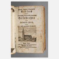 Erhard Andreas Sauerackers Versuch einer Chronologisch-Diplomatisch-Statistischen Geschichte des Hofmarks Fürth und seiner zwölf einverleibten Ortschaften, erster Theil (von 4), bey Georg Friedrich Casimir Schad, Nürnberg und Leipzig 1786, Format Kl. 8°, XXXII und 383 S., mit zwei kleinen Ansichten der St. Michaelis-Kirche in Kupfer, Rotschnitt, im Pappeinband der Zeit, Exemplar der Erstausgabe mit div. Alters- und Gebrauchsspuren, vereinzelt Anstreichungen und einige Besitzervermerke, Einbandrücken unfachmännisch repariert.