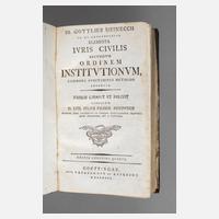 Jo. Gottlieb Heineccii ic. et antecessoris Elementa iuris civilis secundum ordinem institutionum ... passim limavit et polivit libellum D. Lud. Julius Frider. Hoepfner, editio legitima quarta, apud Vandenhoek et Rupfecht, Goettingae , Lipsiae 1767, Format 8°, XVI und 450 S., 15 Blätter, mit zwei gefalteten Tabellen, im Halbledereinband mit Rückengoldprägung, Exemplar mit Alters- und Gebrauchsspuren.