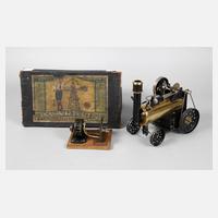 als fahrende Lokomobile, wahlweise als stehende oder liegende Dampfmaschine montierbar, produziert 1919–39, Messing und Blech geschwärzt, Flammrohrkessel mit Sicherheitsventil, Dampfpfeife, Ablasshahn, imitiertem Fliehkraftregulator, doppelt wirkendem feststehenden Zylinder, Schwungrad sowie verwandelbarem Schlot und Rechaud, beide mit Abdeckung, Brenner integriert, als große Ausführung mit Lochscheibenrädern sowie zahlr. weitere Bau- und Zubehörteile wie Schürhaken, Ölflasche etc., in orig. Karton mit Innenunterteilung und montiertem Titelbild, dazu kleine Transmission und Dynamo mit Schaltbrett, auf Holzsockel montiert, Funktion nicht geprüft, kaum Gebrauchsspuren, Kessel L 20 cm, D 7 cm, Maße gesamt ca. 24 x 26 x 16 cm.
