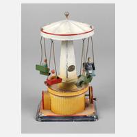 um 1930, gemarkt, Modell 785, Blech handbemalt, mit fünf Gondeln und orig. Massefiguren, min. Alters- und Gebrauchsspuren, H 22 cm, Sockel 13 x 9 cm.