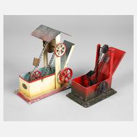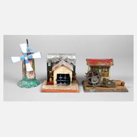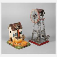 1930er Jahre, gemarkt, Blech farbig handlackiert, Betriebsmodell ”Müller”, Modellnr. 791, als naturalistisch geprägtes Gebäude mit durchbrochen gearbeiteten Fenstern und mittels Flaschenzug Säcke hochziehendem Müller, H 17 x L 18 x B 13 cm, sowie ”Windmotor mit Hammerwerk”, Modellnr. 668, H 29 cm, Sockel 12,5 x 12,5 cm, untersch. Alters- und Gebrauchsspuren, Müllerfigur fehlt, Windrad mit gelockertem Ziegeldach und Lötstelle.