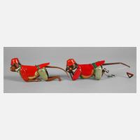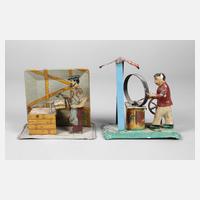 als Wagenschmied von Carette, um 1900, ungemarkt, Blech farbig handlackiert, mit beweglicher plastischer Figur unter Vordach, dieses gelötet sowie altersbedingte Farbabplatzer, dazu Blechner von Wilhelm Krauss für Falk, um 1930, ungemarkt, Blech farbig lithogr., mit beweglicher flacher Figur vor Kulisse in Fachwerkoptik, untersch. Alters- und Gebrauchsspuren, H 12,5 bzw. 15 cm, Sockel je 14 x 8 cm.