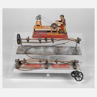 um 1930/40, ungemarkt, Guss und Blech farbig gefasst, bestehend aus einem Antriebsmodell von Arnold, als Mann an Säge mit Hochtransmission, H 11 cm, Sockel L 17,5 x B 9 cm, sowie zwei Transmissionen mit je sechs Laufrädern, L Blechfundament je 30 cm, dazu drei lose Laufräder, untersch. Alters- und Gebrauchsspuren.