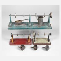 1930er Jahre, einmal gemarkt, Guss und Blech, teils farbig lackiert, bestehend aus drei versch. Transmissionen auf Metallfundamenten, darunter Doll Transmission mit fünf Laufrädern, Modellnr. 653/2, L 28,5 cm, sowie Dochtbrenner, Messbecher und drei Trichter, untersch. Alters- und Gebrauchsspuren.