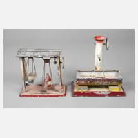 1930er Jahre, einmal gemarkt, Blech farbig hand- bzw. spritzlackiert, Doll ”Schiffschaukel” mit zwei Gondeln und einer (von vier) Massefiguren, Modellnr. 929, H 13,5 cm, Sockel L 13,5 x B 7 cm, dazu Pumpbrunnen, H 16 x B 15,5 x T 9 cm, untersch. Alters- und Gebrauchsspuren, Mechanik des Brunnens klemmt.