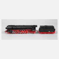 dat. 1987, Kunststoffausführung in Rot-Schwarz, Spur H0, Modell 5/6320, Achsfolge 2C1, Kohletender 4-achsig, Gehäuse abnehmbar, mit zwei orig. Anleitungsblättern im orig. Karton, unbespielter Zustand, Karton lädiert, L ges. 29 cm.