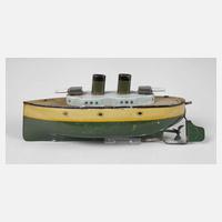 um 1915, ungemarkt, Blech farbig gefasst, mit Uhrwerksantrieb (überdreht), zwei Schloten, beide Geschütze, Schiffsschraube und Ruder beweglich, ohne Schlüssel, bespielter Zustand, zwei kleine Lötstellen und nicht ganz komplett, L max. 20 cm.
