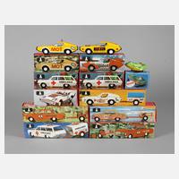 VEB Plasticart Annaberg-Buchholz, 1970er Jahre, alle gemarkt, Blech farbig gefasst sowie Kunststoff, bestehend aus elf versch. Modellen, tlw. mit Anhänger, bezeichnet als ambulance, fire chief, dixieland, sport, rallye, pilot sowie touren car with boat, einige doppelt, alle mit intaktem Schwunglaufwerk, dazu springender quak frog mit intaktem Uhrwerksantrieb und Schlüssel, in orig. Karton, unbespielte Zustände, L 15 cm bzw. 24 cm (inkl. Anhänger).