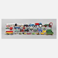 Mitte 20. Jh., vorw. gemarkt Siku, Guss, Blech und Kunststoff farbig gefasst, bestehend aus ca. 15 Bau- und Landwirtschaftsfahrzeugen, teils mit Anhängern, untersch. bespielte Zustände, vereinzelt bestoßen, L Traktor max. 17 cm.