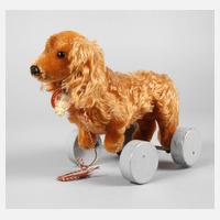 1930er Jahre, gemarkt mit Knopf, Fahne, Nr. 1317ex und Brustschild, kupferbrauner, langhaarigen Mohair, holzwollegestopft, mit schwarzen Augen, Nasenbestickung, Lederhalsband, verstummter Stimme und Zugband, auf hölzernen, farblich übergangenen Exzenterrädern stehend, min. Gebrauchsspuren, L 25 cm.