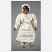 2. Hälfte 19. Jh., ungemarkt, geschnitzter, polychrom gefasster Brustblattkopf mit geschlossenem Mund, gemalten Augen, Lidstrich sowie gemalten Haaren in Schwarz, holzwollegestopfter Stoffkörper mit Schlenkergliedern, geschnitzten Unterarmen und -beinen, alt bekleidet, min. Farbabplatzer, L 53 cm.