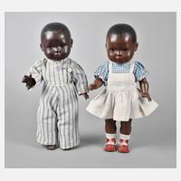 sog. Negerpuppen als Krieger ”Wumbi” und seine Schwester ”Mambi”, 1930/50er Jahre, beide Köpfe gemarkt SiR 32/34, Körper SiR 34 bzw. SiR T34, in untersch. Brauntönen gefärbtes Celluloid bzw. Mädchentorso Tortulon, Kurbelkopf mit geschlossenem Mund, feststehenden braunen Glasaugen und modellierten Kräusellöckchen, 5-teiliger Stehkörper mit angewinkelten Armen, wohl orig. bekleidet, kaum bespielter Zustand, Mädchen am Hinterkopf mit Kratzspuren, L 33 cm.