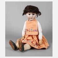 um 1900, gemarkt 16 S & C, Biskuitporzellan-Kurbelkopf mit offenem Mund, vier Zähnen oben, fester Zunge, braunen Schlafaugen, gemaltem Wimpernkranz, gefiederten Brauen, Kinngrübchen, durchstochenen Ohrläppchen sowie brauner Echthaarperücke, 11-teiliger Gliederkörper aus Holz, Pappmaché und Masse, mehrteilig alt bekleidet, bespielter, angestaubter Zustand, Körper partiell farbig übergangen, L 80 cm.