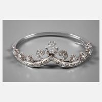 2. Hälfte 20. Jh., Weißgold gestempelt 14 K = 585/1000, Mittelteil als Diadem gestaltet, besetzt mit ca. 52 Brillanten von max. 0,24 ct, gesamt ca. 1,7 ct , SI-P1/W, Reifdurchmesser max. 60 mm, Verschluss als verdecktes Kastenschloss mit Sicherheitsacht und Sicherheitskettchen, Gewicht ca. 20,5 g.
