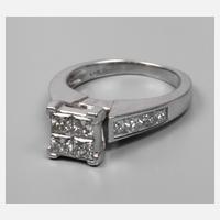 Ende 20. Jh. Weißgold gestempelt 14 kt = 585/1000, hochgesetzter quadratischer Ringkopf mit vier Diamanten im Princess-Cut, seitlich in Ringschiene acht Diamanten im Princess-Cut, gesamt ca. 1,0 ct TW/VS, RW 16,5 mm, Gewicht ca. 5,6 g.