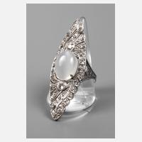 1. Hälfte 20. Jh., Platin geprüft, navettenförmiger Ringkopf in aufwendiger Durchbrucharbeit mit Brillantbesatz von ca. 1 ct, max. Steingewicht ca. 0,22 ct, mittig Mondsteincabochon in Krappenfassung von ca. 13 x 10 mm, Ringkopfhöhe ca. 47 mm, RW 18 mm, Gewicht ca. 11,2 g.