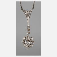 um 1900, Weißgold und Gelbgold 585 geprüft, besetzt mit 13 Brillanten in guter Qualität, gesamt ca. 0,5 ct, Länge Mittelteil ca. 30 mm, Länge Kette ca. 45 cm, Gewicht ca. 3,0 g.