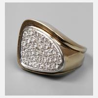 2. Hälfte 20. Jh., Gelbgold und Weißgold gestempelt 14kt = 585/1000, Ringkopf mit 34 Brillanten in Pavéfassung, zusammen ca. 0,7 ct, von guter Qualität, Ringkopfhöhe ca. 20 mm, RW 19 mm, Gewicht 13,0 g.