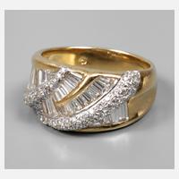 2. Hälfte 20. Jh., Gelbgold und Weißgold gestempelt 18 K und 750, zum Ringkopf sich verbreiternder Bandring, besetzt mit 24 Diamantbaguetts, 3 Diamantdreiecken und zahlreichen winzigen Brillanten, gesamt ca. 2,0–2,5 ct, VVS/TW, RW 20 mm, Gewicht ca. 11,6 g.