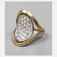 datiert 1994, Gelbgold und Weißgold gestempelt 18 K = 750/1000, zum Ringkopf hin geteilt gearbeitete Schiene und eingesetztem, konkav gebogenem Oval aus Weißgold, ausgefasst mit zahlreichen Brillanten in Pavéfassung, gesamt ca. 1,4 ct, VVS/TW, RW 17 mm, Gewicht ca. 12,9 g.