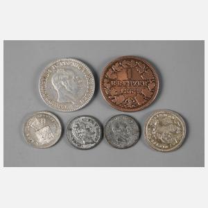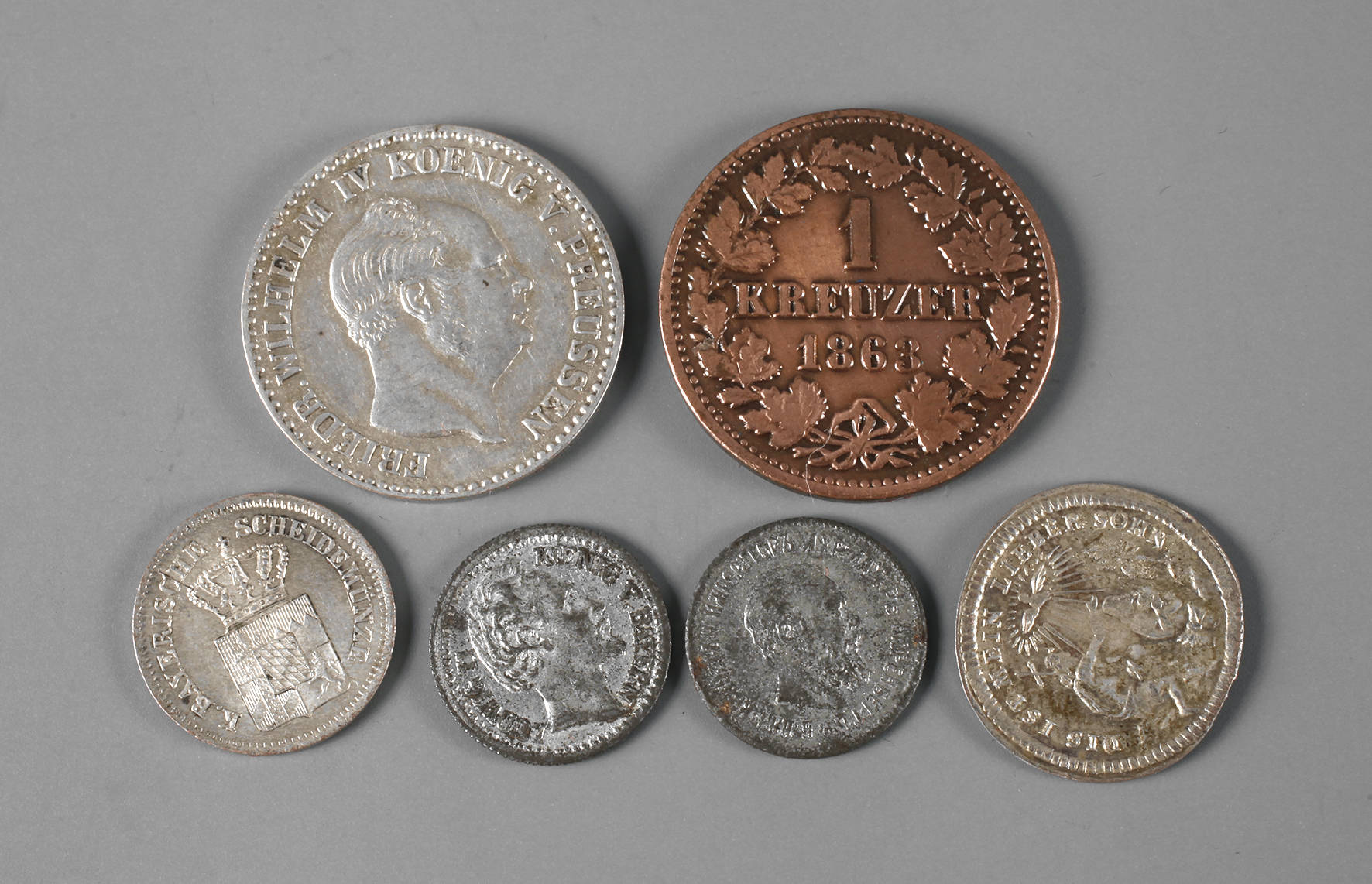 2 1/2 Silbergroschen Preußen 1855, vz., Kreuzer Kupfer Nassau 1863, fvz., Kreuzer Silber Bayern 1865, fstgl., zwei kleine Spielmünzen Ludwig II. Bayern und 25 Kopeken Russland 1889, beide ss+, dazu kleine Taufmedaille Silber, etwas gewellt, vz.