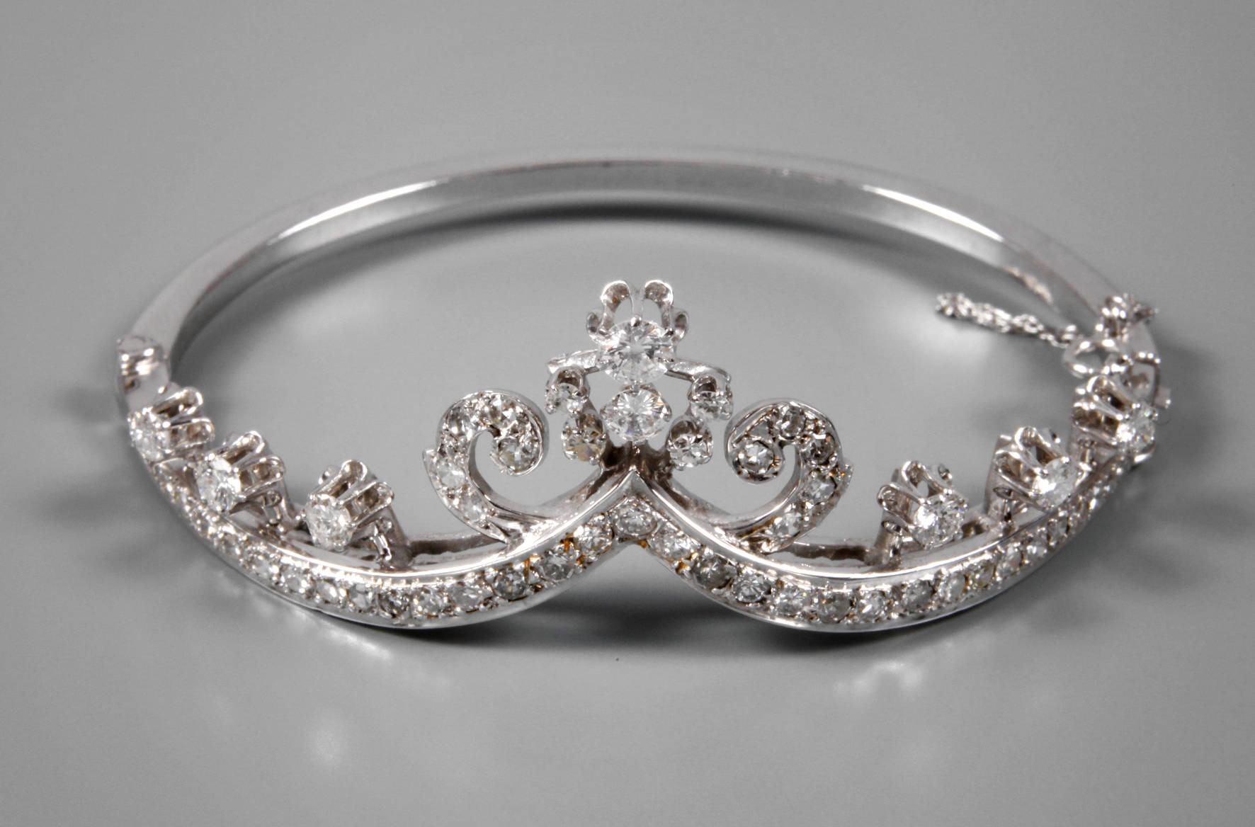 2. Hälfte 20. Jh., Weißgold gestempelt 14 K = 585/1000, Mittelteil als Diadem gestaltet, besetzt mit ca. 52 Brillanten von max. 0,24 ct, gesamt ca. 1,7 ct , SI-P1/W, Reifdurchmesser max. 60 mm, Verschluss als verdecktes Kastenschloss mit Sicherheitsacht und Sicherheitskettchen, Gewicht ca. 20,5 g.