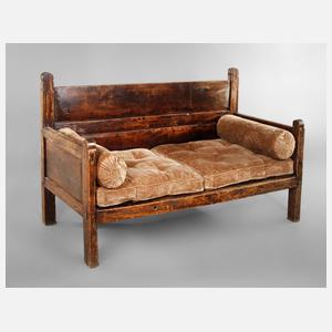 Frankreich, 18./19. Jh., aus massivem Platanenholz gefertigte schlichte Bank mit hoher Lehne, aufgelegte Sitzkissen später ergänzt, Maße 116 x 183 x 82 cm.