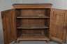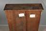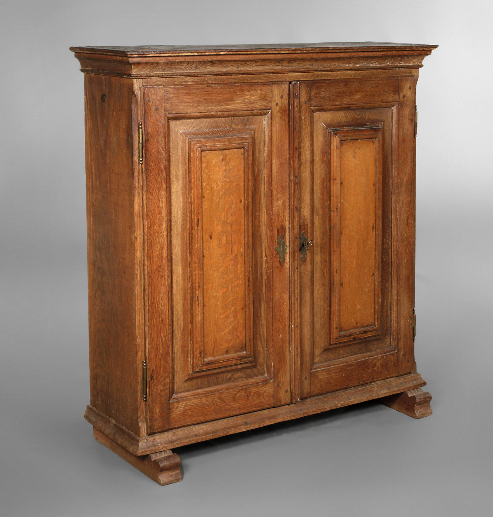 Mitte 18. Jh., Eiche massiv, flacher zweitüriger Unterschrank mit Kassettenfüllungen, Beschläge, Schloss und Schlüssel ergänzt, Oberfläche mit Altersspuren, Maße 108 x 103 x 31 cm.