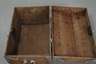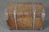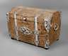 Mitte 18. Jh., Eiche massiv, Runddeckeltruhe mit schmiedeeisernen Beschlägen, diese floral verziert und graviert, originales Zangenschloss mit Schlüssel, Altersspuren, Maße 43 x 60 x 40 cm.