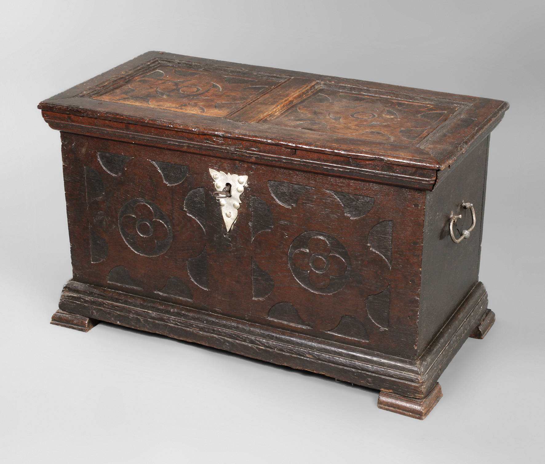 2. Hälfte 18. Jh., Eiche massiv, dunkelbraun gebeizt, Front und Deckel mit ornamentaler Oberflächenschnitzerei, orig. Schloss und Schlüssel, Beilade fehlt, Beschläge später silberbronziert, Altersspuren, Maße 46 x 77 x 38 cm.