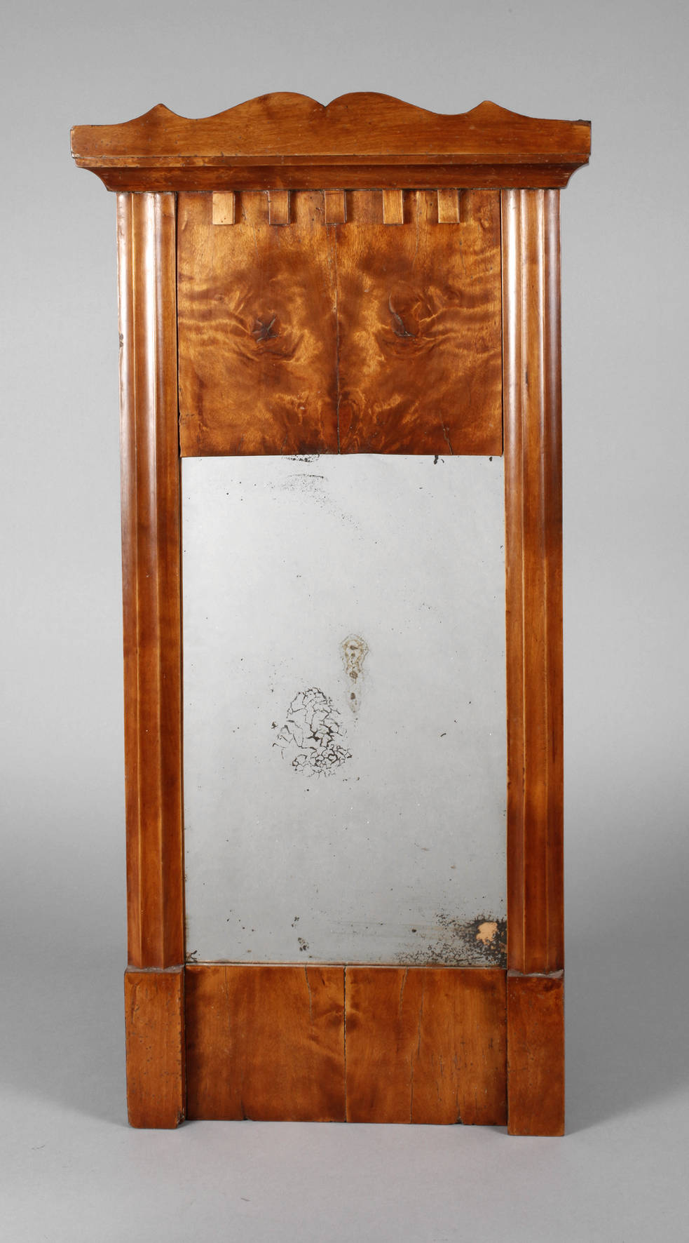 um 1840, Eisbirke auf Nadelholz furniert, originales Spiegelglas, Altersspuren, etwas rest.bed., Maße 86 x 40 cm.