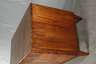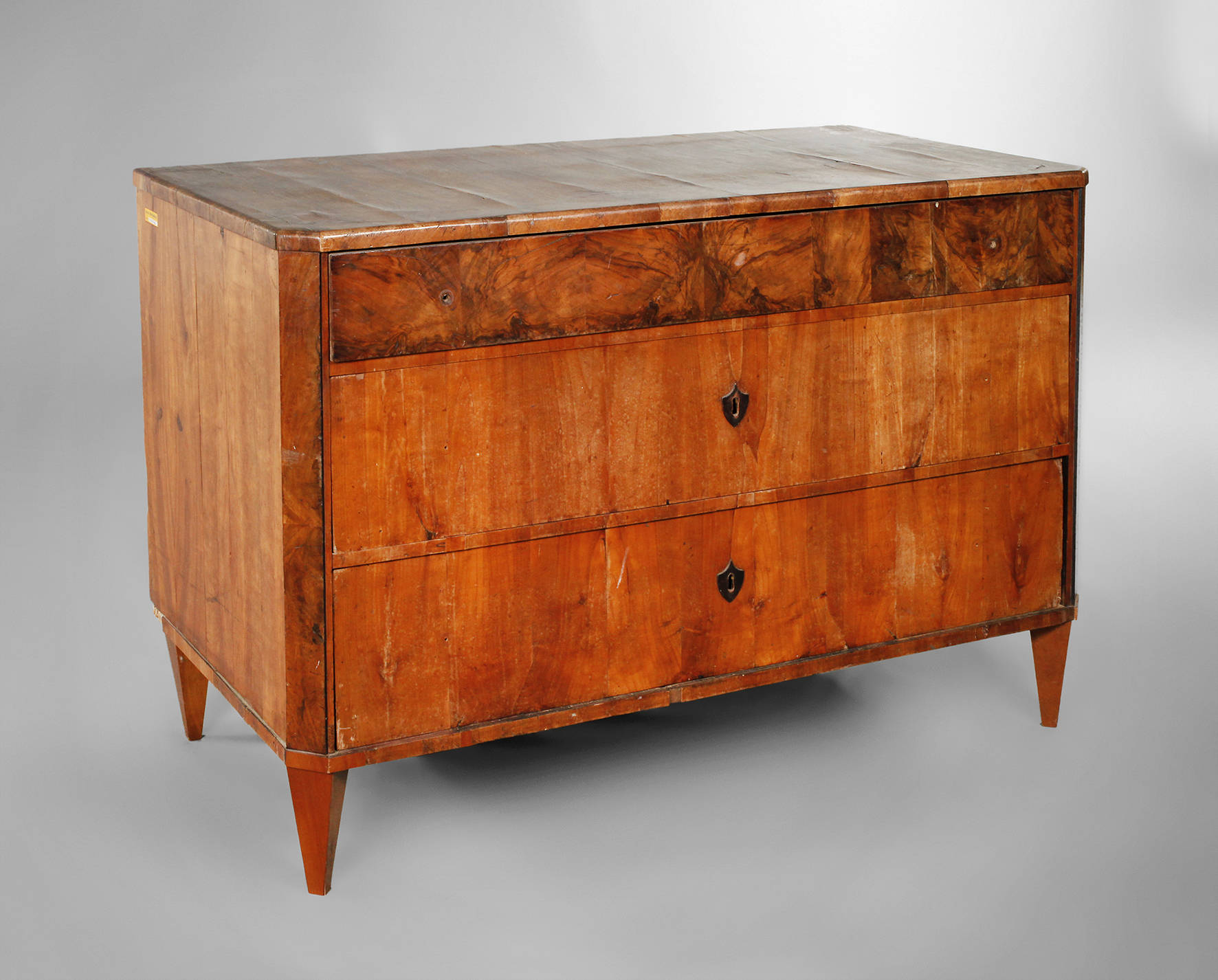 1. Drittel 19. Jh., Kirschbaum und Nussbaummaser auf Nadelholz furniert, dreischübiger Korpus mit abgeschrägten Ecken auf Spitzfüßen, ca. 2–3 mm dickes Sägefurnier, originale Schlösser, unrestaurierter Originalzustand, mit Alters- und Gebrauchsspuren, Beschläge am oberen Schub fehlen, rest.bed., Maße 81 x 124 x 64 cm.
