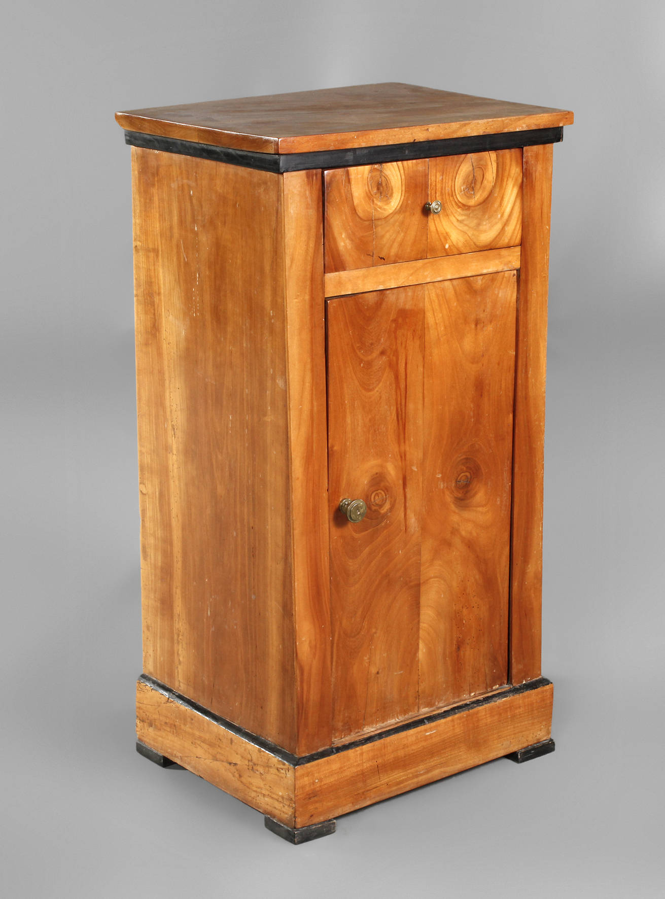 1. Drittel 19. Jh., bis zu 5 mm dickes Sägefurnier auf Nadelholz, eintüriger Kasten mit Schubfach und ebonisierten Zierleisten, Maße 81 x 41 x 35 cm.