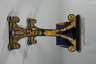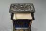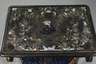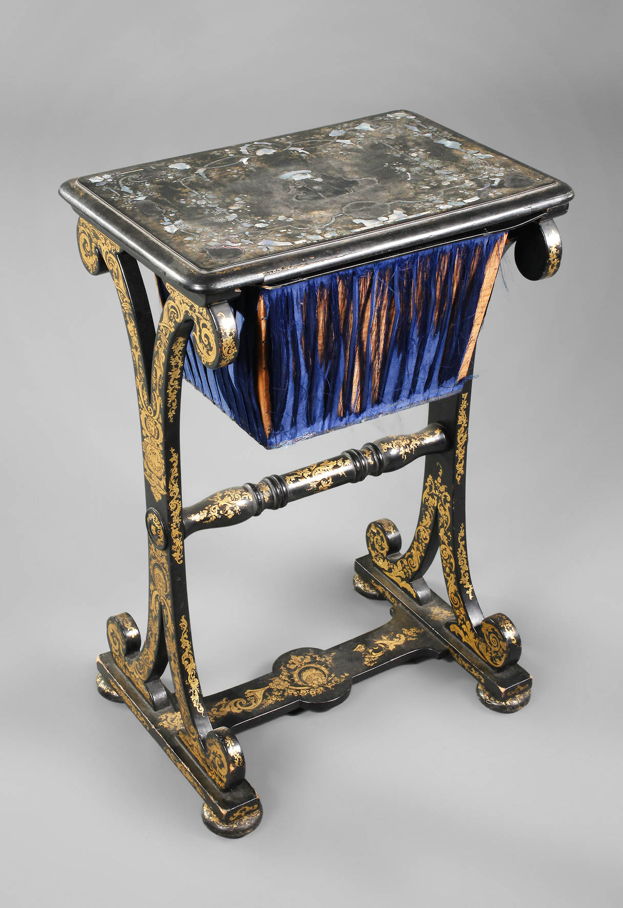 wohl England, 2. Hälfte 19. Jh., Lacktisch mit feinem Golddekor, die Platte mit aufwendiger Perlmuttintarsie, darunter nach beiden Seiten schiebbares Wollfach mit Resten originaler Seidenbespannung, Intarsie der Platte mit Fehlstellen, rest.bed., Maße 73 x 49 x 33 cm.