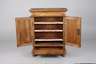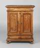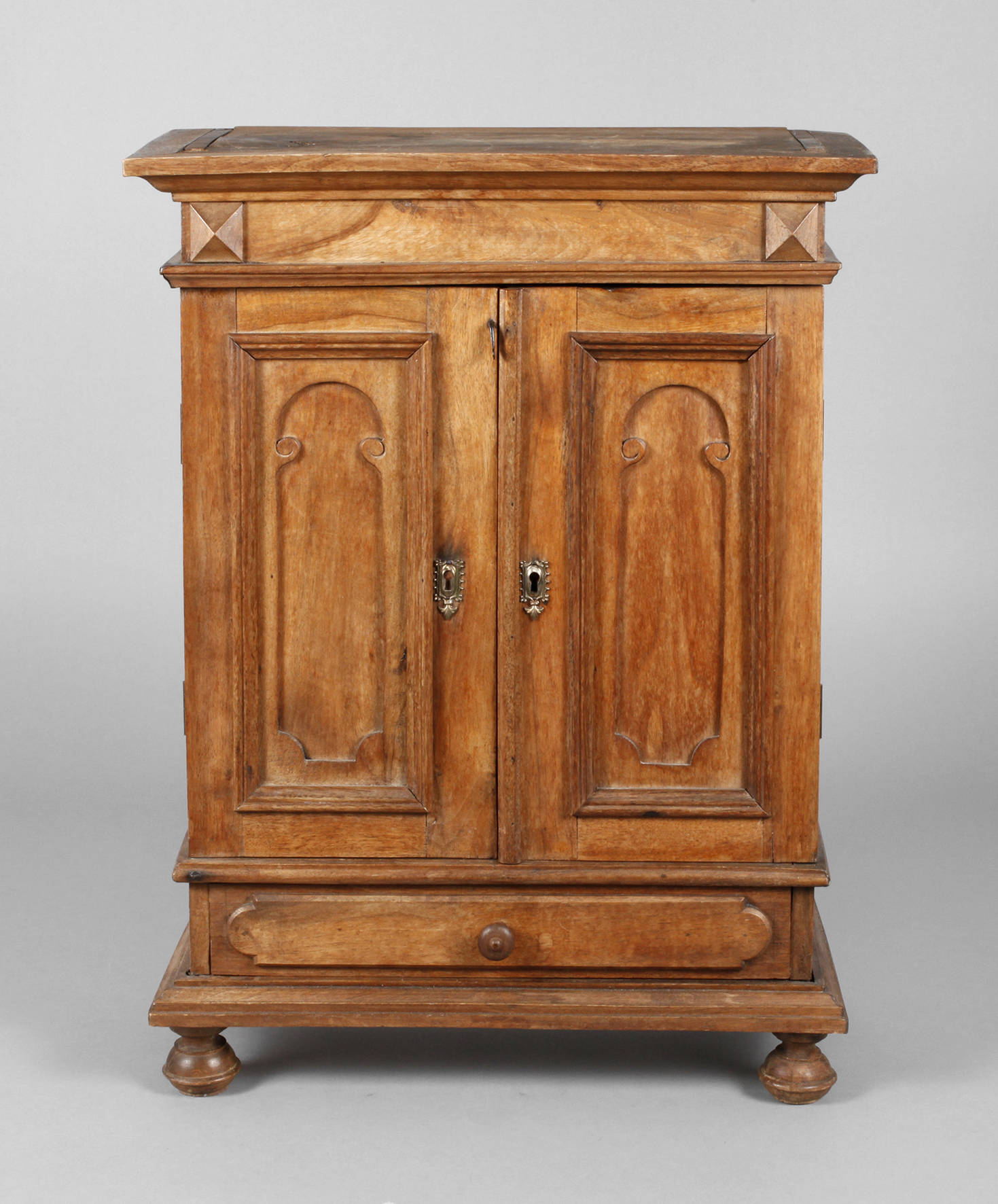 Nussbaum massiv, um 1900, kleines zweitüriges Wandschränkchen mit vier Einlegeböden und Schubkasten, Schlüssel fehlt, Oberfläche rest.bed., Maße 56 x 43 x 20 cm.