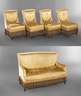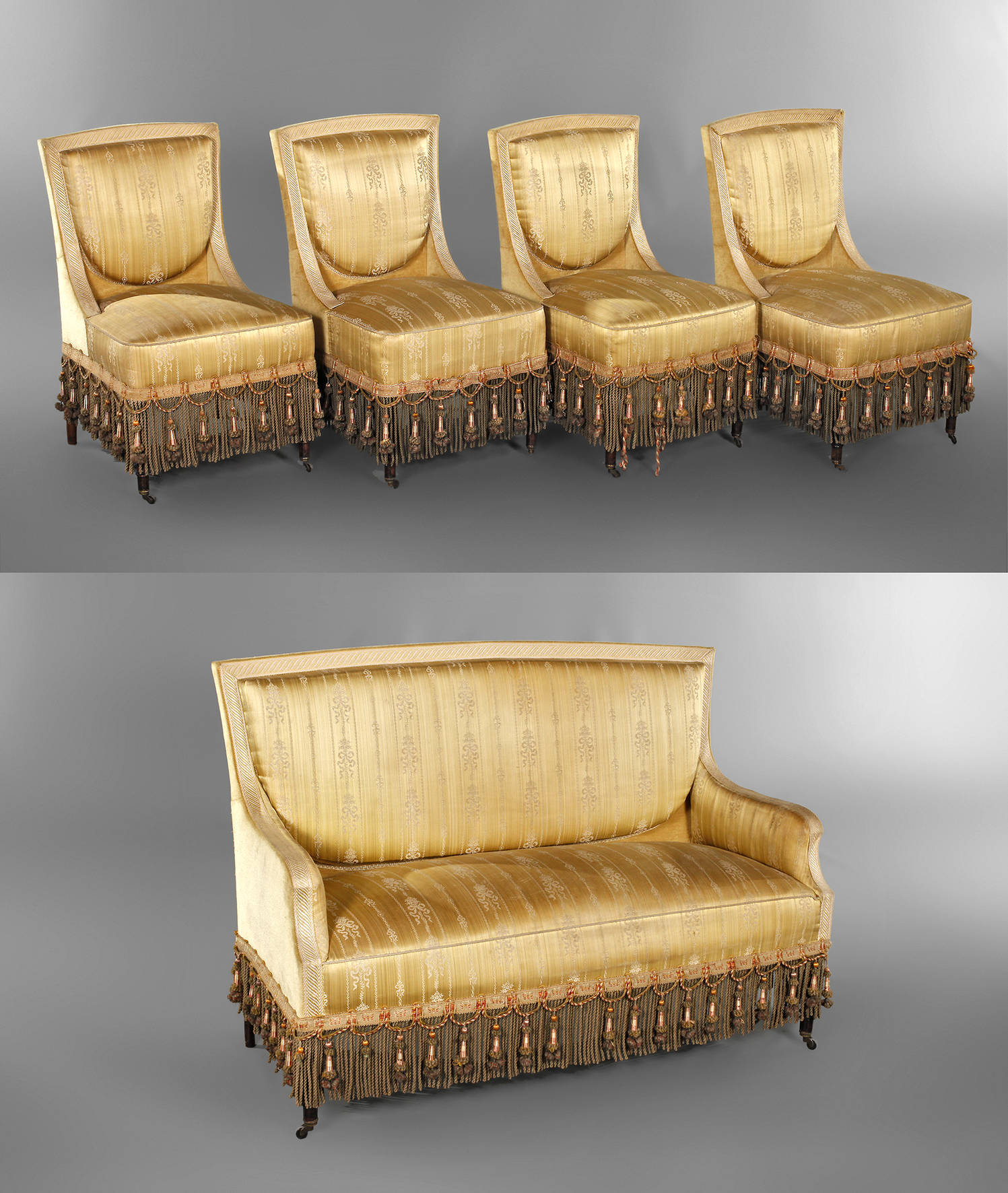 um 1900, bestehend aus Sofa und vier Sesseln, Bezüge erneuert mit senfgelbem Seidenstoff mit klassizistischen Ornamenten, die Rückseiten in dazu passendem Samt bezogen, originaler Kordelbehang mit Quasten erhalten, wohnfertiger Zustand, Maße Sofa 98 x 138 x 73 cm.