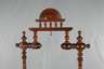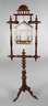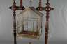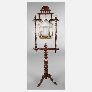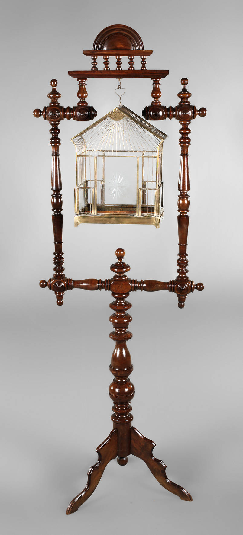 Historismus, um 1880, Gestell aus gedrechseltem Nussbaum, auf dreibeinigem Fuß mit Balusterschaft, Vogelkäfig aus Messing mit geschliffenem Kristallglas, guter Zustand, H 174 cm.