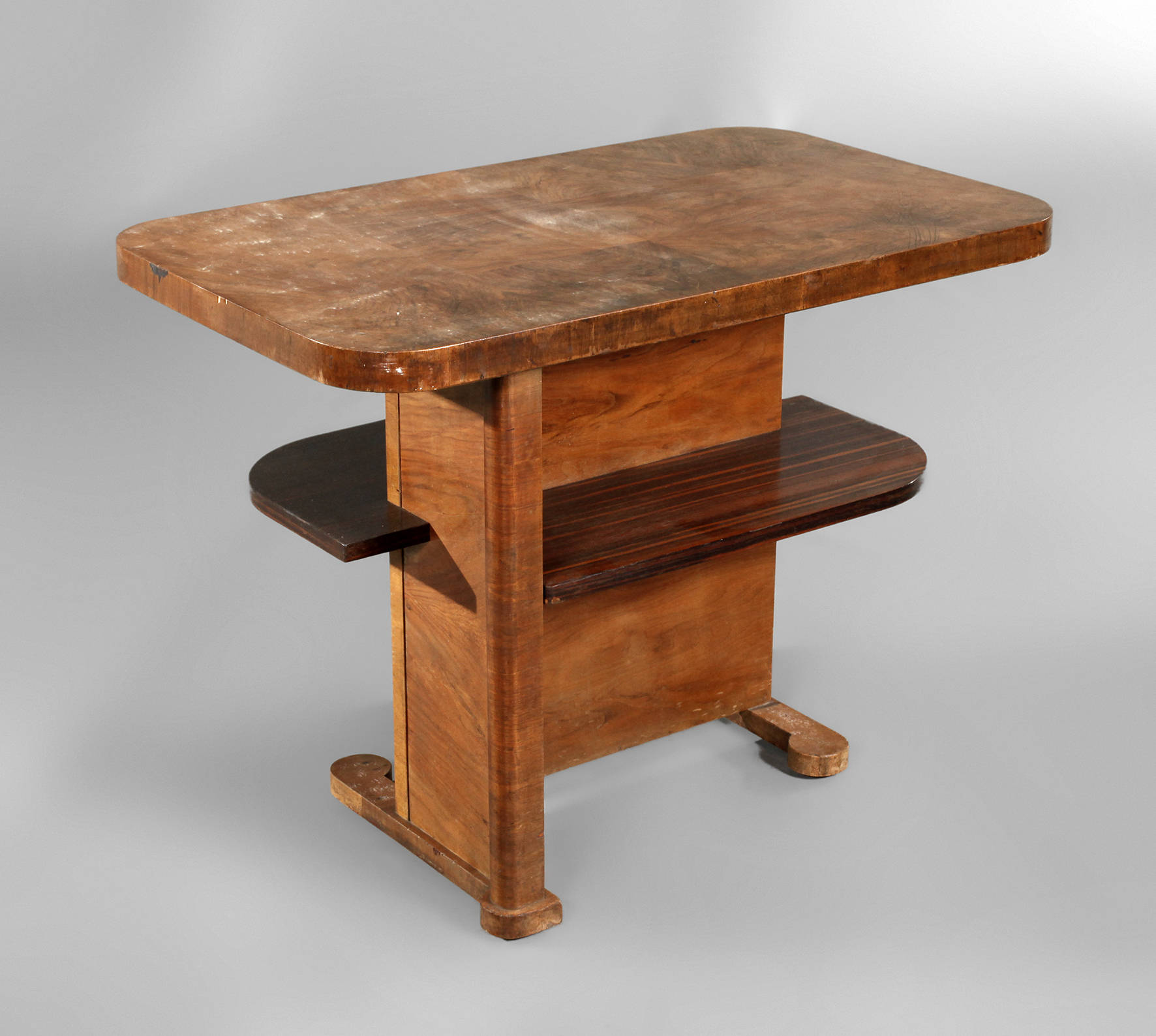 1930er Jahre, Palisander und Nussbaummaser furniert, rechteckige Platte mit abgerundeten Ecken, das spiegelsymmetrisch gegliederte Gestell beidseitig mit Ablage, kleine Furnierfehlstellen, Altersspuren, Maße 59 x 80 x 48 cm.