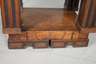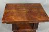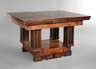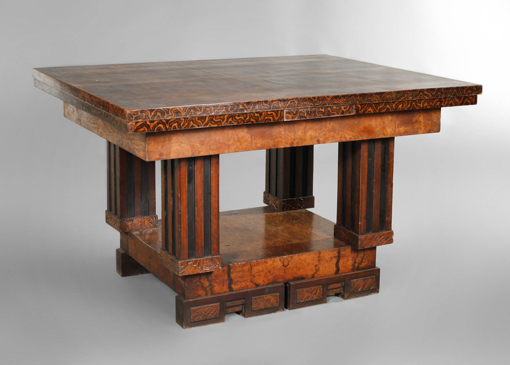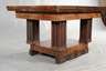 wohl Frankreich, 1930er Jahre, Nussbaum und Nussbaumwurzel furniert, die Kanten der Tischplatte mit gemalter Maserung, massives Untergestell mit schweren kannelierten Vierkantsäulen, Sockel verziert mit ornamental beschnitzten Plaketten, Alters- und Gebrauchsspuren, Maße 80 x 134 x 105 cm, L max. 240 cm.