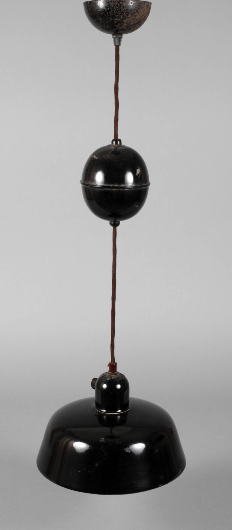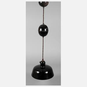 Modell 6663, Entwurf Christian Dell um 1930, zeitnahe Ausführung Kaiser & Co., Neheim-Hüsten, auf dem Schirm gemarkt, Weißblech außen schwarz und innen weiß lackiert, Pendelleuchte an Textilkabel, höhenverstellbar, einflammig elektrifiziert, Altersspuren, D 25 cm, H variabel.