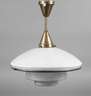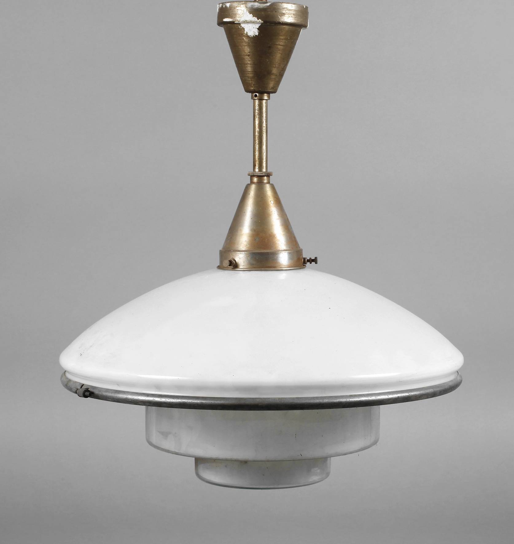 Entwurf Otto Müller 1931, Fa. Müller & Zimmer Stuttgart, zweifach getreppter Schirm mit eingelegten, weiß überfangenen Ringen, vernickelte Messingmontierung, schlanke, geometrisch gestaltete Deckenhalterung, einflammig neu elektr., Metall mit leichten Altersspuren, Ring mit Risslinie, ein zusätzlich beigegebener Schirm, H ca. 67 cm, D 41 cm.